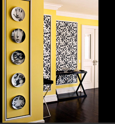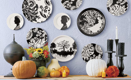 Puedes usar platos decorados en blanco y negro, uno de mis preferidos. E incluso los puedes poner en una columna. Le darán un toque muy personal al lugar.