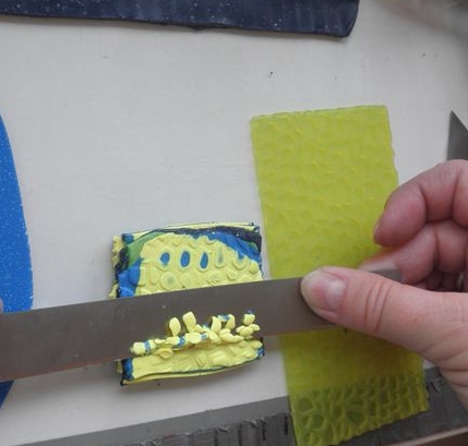 Paso 7: Toma estos pedacitos y colócalos sobre una lámina de arcilla del color que prefieras. En este caso se usó una azul.