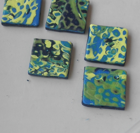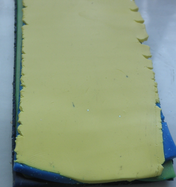 Paso 1: Una vez que tengas la arcilla polimérica debidamente plana, se trata de ir colocando un color sobre el otro. Por ejemplo, en este caso se ha colocado el color verde sobre el azul oscuro.