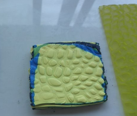 Paso 5: Toma la lámina y colócale encima la textura, en este caso se utilizó una imitación de piel de cocodrilo pero puedes usar la textura que quieras. Presiona fuerte para que se marque bien en la arcilla.