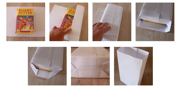 Paso 1: Toma un libro grueso, envuelve el papel a su alrededor y une los extremos usando la cinta adhesiva. Después, dobla la parte inferior y une una vez más con la cinta adhesiva. Retira el libro.