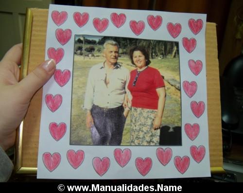 Imprime el marco de corazones. Pinta los corazones con color rojo o de varios colores. Corta el centro donde irá la fotografía. Pega la foto que te guste en un cartón (en mi caso, elegí una fotografía de mis abuelitos) y céntralo para que entre en la ventanita del portarretratos. Pega el marco del portarretratos encima del cartón con la foto ya pegada. Ya tienes el porta retratos, ahora solo tienes que pegar el pie en un cartón y pegarlo como muestra el ejemplo de la imagen. Puedes ponerle un vidrio encima para cubrir la fotografía. También puedes utilizar un portarretratos comprado y colocar en él tu marco de corazones con la foto.