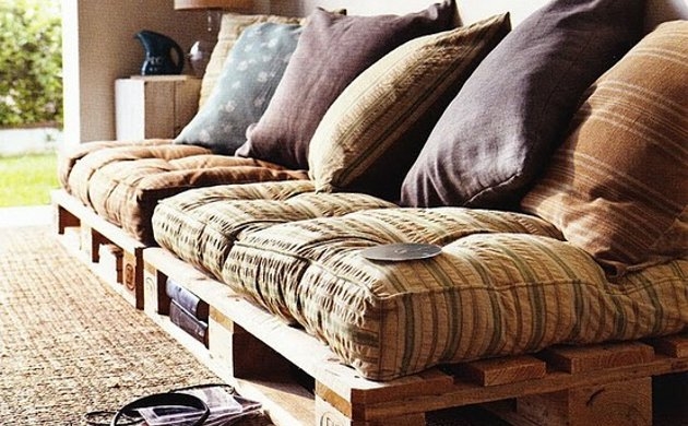 7. Tomar los palets, tal como son y colocarlos en el piso como base para un sofá improvisado. Te bastará colocar los cojines contra la pared. Más sencillo, imposible.