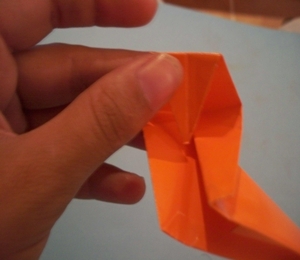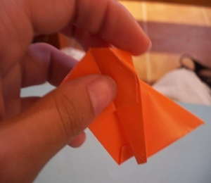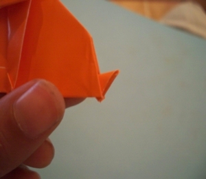 Cada paso esta detallado en las imágenes, ahora vamos a utilizar las esquinas de la cabecita del gato que serán las orejas, primero las doblamos hacia dentro y luego doblamos hacia afuera pero dejando un pequeño espacio. En las fotos pueden apreciarlo mejor. En la primera foto, esta el futuro gato mirando de frente, en la segunda, estamos doblando las esquinas de la cabeza hacia adentro, y en la tercera, se ha doblado hacia afuera pero se deja una pequeña orejita.