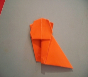 Cuando ya esté doblado, cogemos la parte superior y la doblamos hacia atrás. En la primera foto se observa la parte de atrás luego de este primer doblez, la segunda es de frente y se trabajará la carita del gatito. Seguido cogemos la punta de la parte de abajo de la carita y la doblaremos hacia adentro (tercera foto).