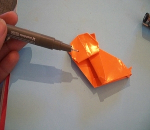 Nos faltaría hacerle el rabito, hacemos el proceso similar al de las orejitas, solo que esta vez con la punta inferior derecha tomando en referencia la última imagen de arriba. El resultado lo vemos en la primera foto de abajo. Finalmente, dibujamos la carita del gato y nos quedaría como en la última foto que aquí les mostramos. Espero que les haya gustado. Háganlo, está sencillo y curioso.