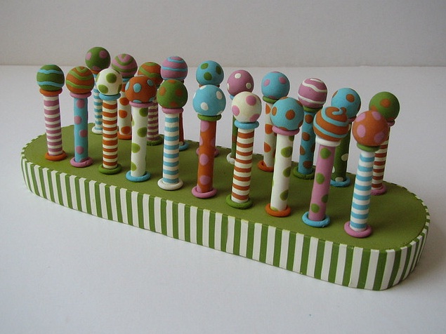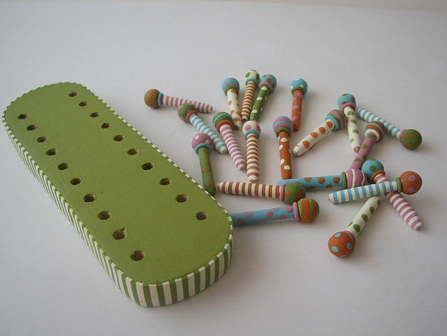 Ahora deberás crear los nuevos “pelos del cepillo” que serán los que sostengan las cartas. Para ello lo mejor es utilizar la arcilla polimérica. Una vez que estén secos, podrás pintarlos. Ten el cuidado de tomar bien las medidas de forma que cuando la arcilla se seque, no tengas problemas para introducirlas.