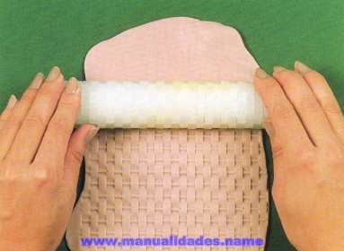 2 – Estirar un recorte de masa coloreada a gusto hasta lograr ½ cm de espesor y estamparla con el rodillo para mimbre. Cortar la masa con la medida del alto y del contorno de la lata.