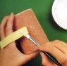 C) Realizar, con un acocador metálico, 2 hendiduras en la parte más ancha que luego servirán para ubicar las patas.
