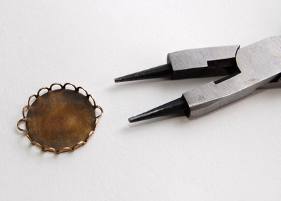 Paso 1: Usando las pinzas, realiza una especie de asas en el camafeo. Tal y como aparece en la imagen a continuación. Te servirá para colocar la cadena. Repite este procedimiento con cada una de las siete bases de camafeo.