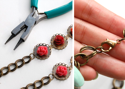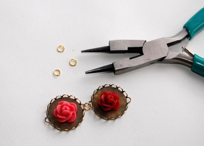 Paso 3: Una vez que hayas pegado todas las rosas y estas estén secas, toma los aros para que puedas crear una cadena entre los camafeos. Inserta los aros en ese especie de asas que hiciste al principio.