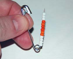 Por ejemplo, en el prendedor 1 deberás colocar 13 cuencas blancas; en el prendedor 2 deberás poner en este orden:  3 blancas, 6 naranjas y 4 blancas. En el prendedor 3 deberás colocar en orden: 2 cuencas blancas, 8 naranjas y 3 blancas. Y así sucesivamente según el patrón.