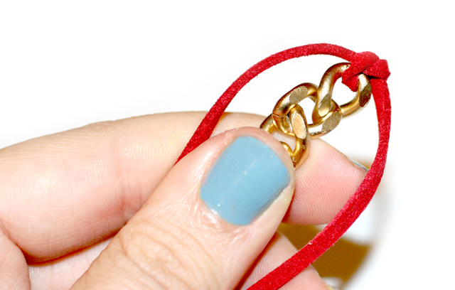 Paso 1: Primero, recorta una tira de piel que sea el doble de la cadena. Luego, justo a la mitad, realiza un nudo en la cadena, tal y como se aprecia en la imagen.