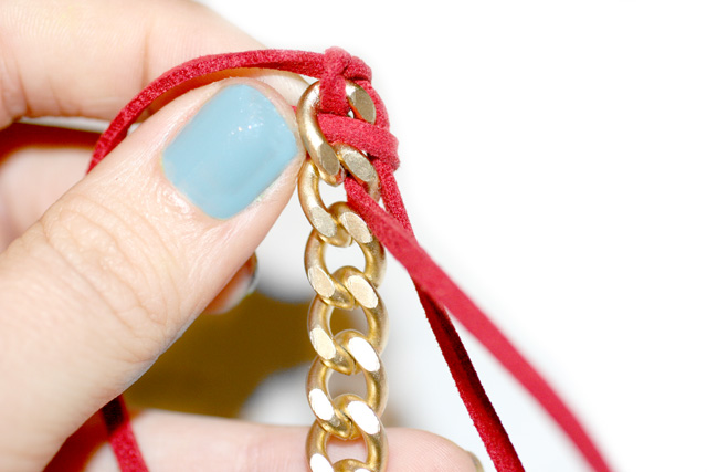 Paso 1: Primero, recorta una tira de piel que sea el doble de la cadena. Luego, justo a la mitad, realiza un nudo en la cadena, tal y como se aprecia en la imagen.