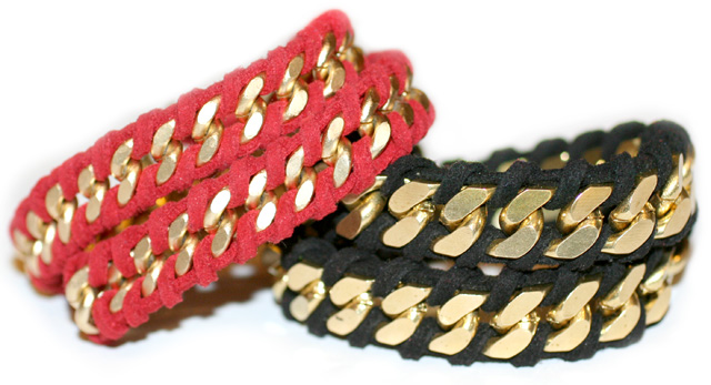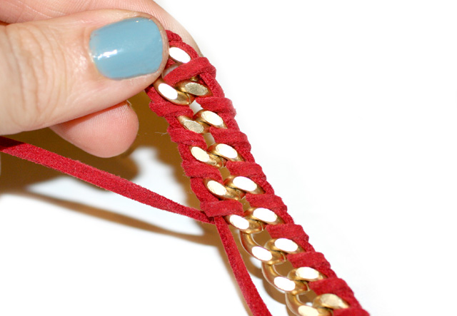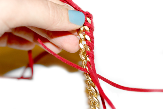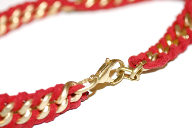 Paso 2: Toma una segunda tira de piel y atraviesa con ella el primer eslabón de la cadena, dale la vuelta por detrás y sujeta con un lazo la tira que ya tenías anudada. Quizás mirando la figura puedas comprender mejor el proceso.