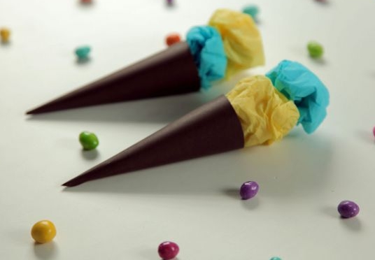 Si estás planificando un cumpleaños y no tienes ni idea de qué hacer para asombrar a los niños, esta idea te vendrá como anillo al dedo. Se trata de unos conos de helado hechos de papel y rellenos con golosinas. De seguro los pequeños no han recibidos regalos sorpresa más originales.