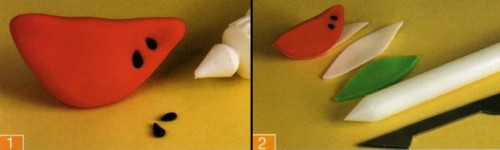 1-Con masa teñida de rojo realiza una media luna y aplánala en uno de los bordes, en el otro dale base haciéndola rodar por la mesa, las semillas son pequeñas lágrimas aplanadas y teñidas de negro, pégalas con cola vinílica en los costados de la sandía.