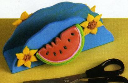 4-Lija bien el servilletero y pinta con acrílico turquesa con tres o cuatro manos, dejando secar entre una y otra. Pega todo sobre el servilletero una vez que las piezas de porcelana se hayan oreado. Cuando el proyecto esté seco, con una fibra verde oscuro realízale ondulaciones en la cáscara de la sandía. Ilumina la sandía con polvo nácar.