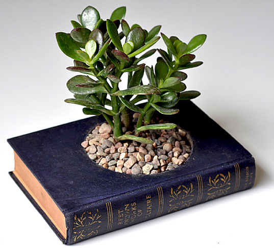 7. Tomar un libro que ya no te interese, recortar el centro y sellar bien los bordes. Añadir la tierra.