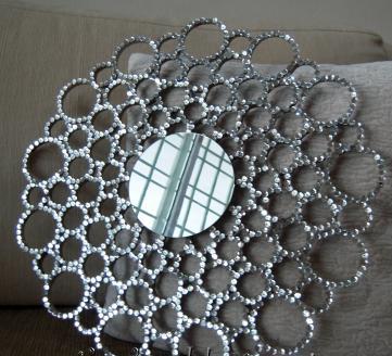 7. Usando tubos de cartón. En este caso, después de poner cada uno de los círculos de cartón, tendrás que aplicarle un spray plateado y colocarle, meticulosamente, pequeñas piedrecillas brillantes. Te podrá parecer un trabajo titánico pero este tipo de espejos en la tienda te puede costar hasta 300 euros.