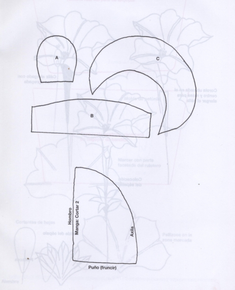 1 – Teñir un recorte de masa con rosa y laminarla hasta conseguir 2 mm de espesor. Cortar las piezas identificadas con la letra (A), (B) y (C) en el patron de moldes. Emprolijar los bordes con los dedos humedecidos con agua.