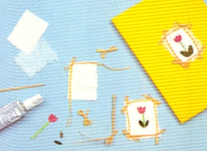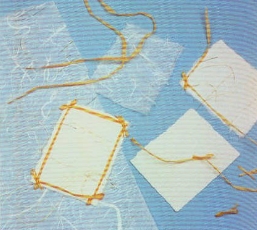 Paso 1: corta a mano un rectángulo de 9 x 7 cm. en el papel de dibujo blanco y otro en el papel blanco hecho a mano y pégalos con cola. Haz un laso en el centro de dos de los trozos de rafia, y pégalos con cola en las esquinas opuestas al borde interior del papel hecho a mano. Recorta los extremos sobrantes de la rafia para que queden dentro de la tarjeta y pégala con cola. Con la rafia sobrante haz dos lazos y pégalos en las otras dos esquinas.