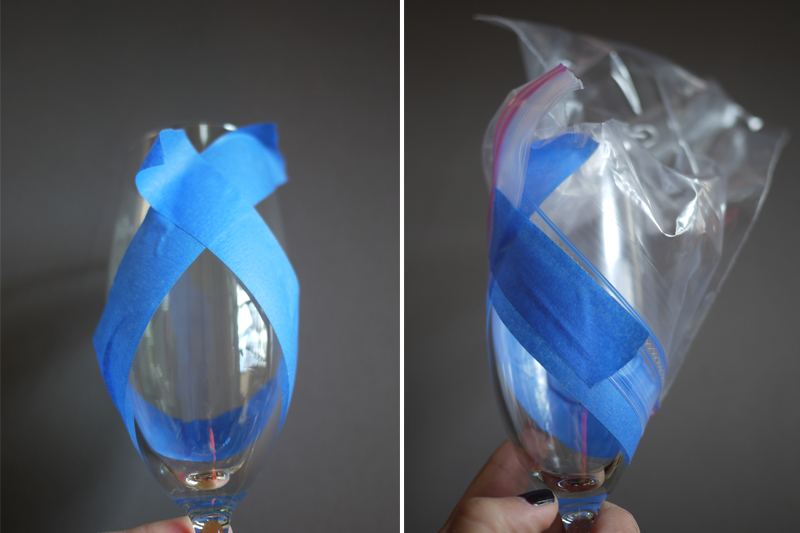 Paso 4: En la mitad de la cinta que no has pegado, coloca el nylon. De esta forma protegerás la parte de la copa que no deseas pintar.